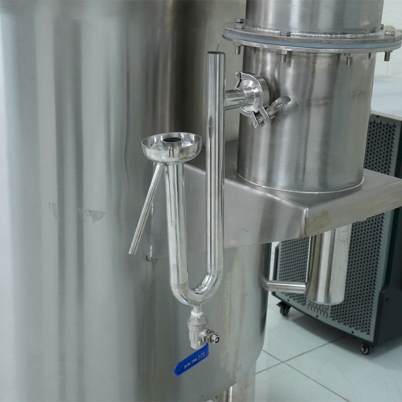 Dàn ống inox dẫn hơi và hệ thống cấp nước làm mát hoạt động tự động có chức năng làm lạnh đột ngột để hóa lỏng hỗn hợp khí. Đầu ra có lắp thêm cồn kế thủy ngân giúp đo nôngd độ cồn trực tiếp và kiểm soát chính xác việc phân tách các thành phần rượu.